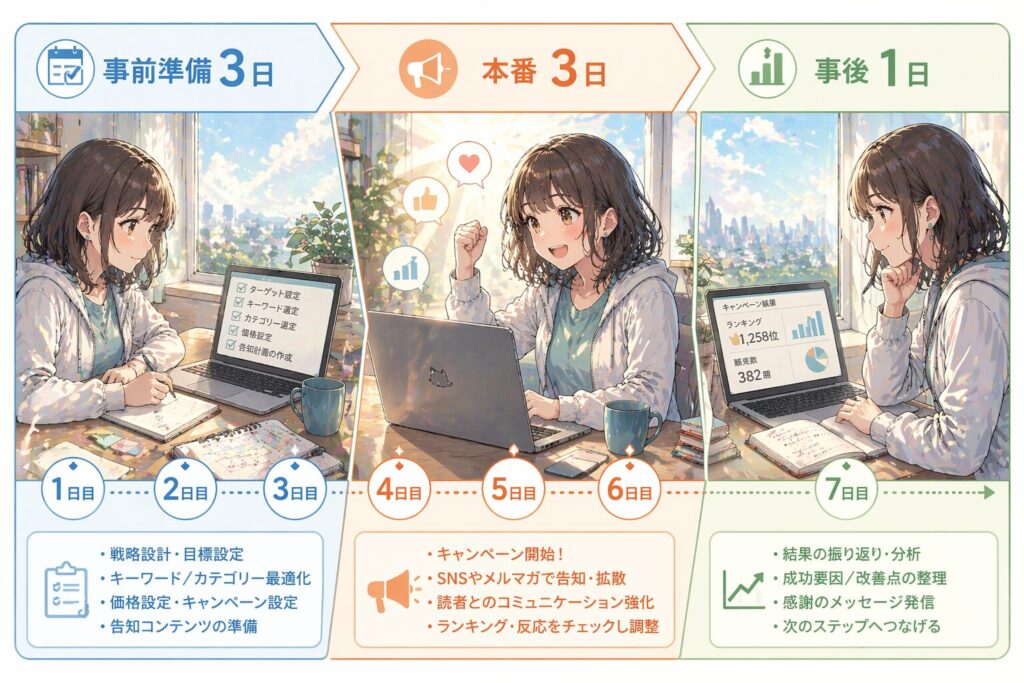 - 【本番3日間】集中プロモーションフェーズ 1日目「開始」、2日目「中押し」、3日目「最終決断(24時まで)」と、買う理由を明確に提示。