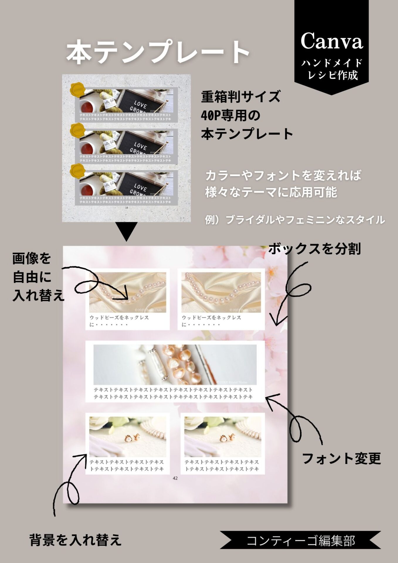 正方形に近い、コンパクトでおしゃれな印象の重箱判テンプレートです。すでにレシピ本の構成が出来上がっていますので、画像や文章、背景などを入れ替えて、ご自身のブランドに合わせたスタイルに簡単アレンジできます。高いクオリティと圧倒的な時短を実現✅表紙&本文(2種)のデザインテンプレート